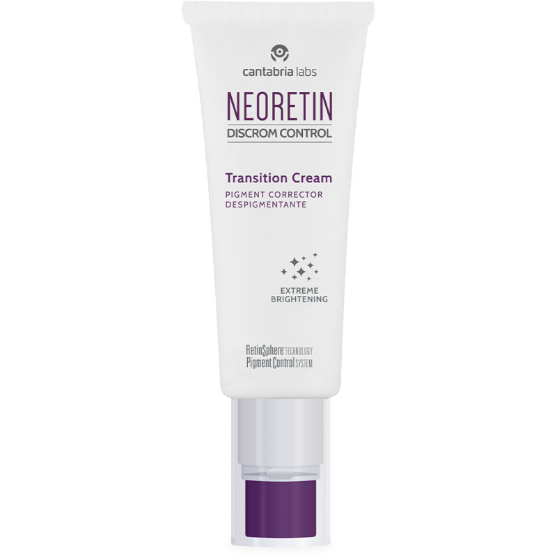 Neoretin Discrom Control Transition Cream, 50 ml, es un tratamiento despigmentante diario formulado para reducir manchas oscuras, unificar el tono y mejorar la luminosidad de la piel. Con RetinSphere® Technology (retinoides de nueva generación), ácido tranexámico y niacinamida, ofrece eficacia despigmentante progresiva con alta tolerancia, ideal para mantener resultados o como paso intermedio entre tratamientos más intensivos.